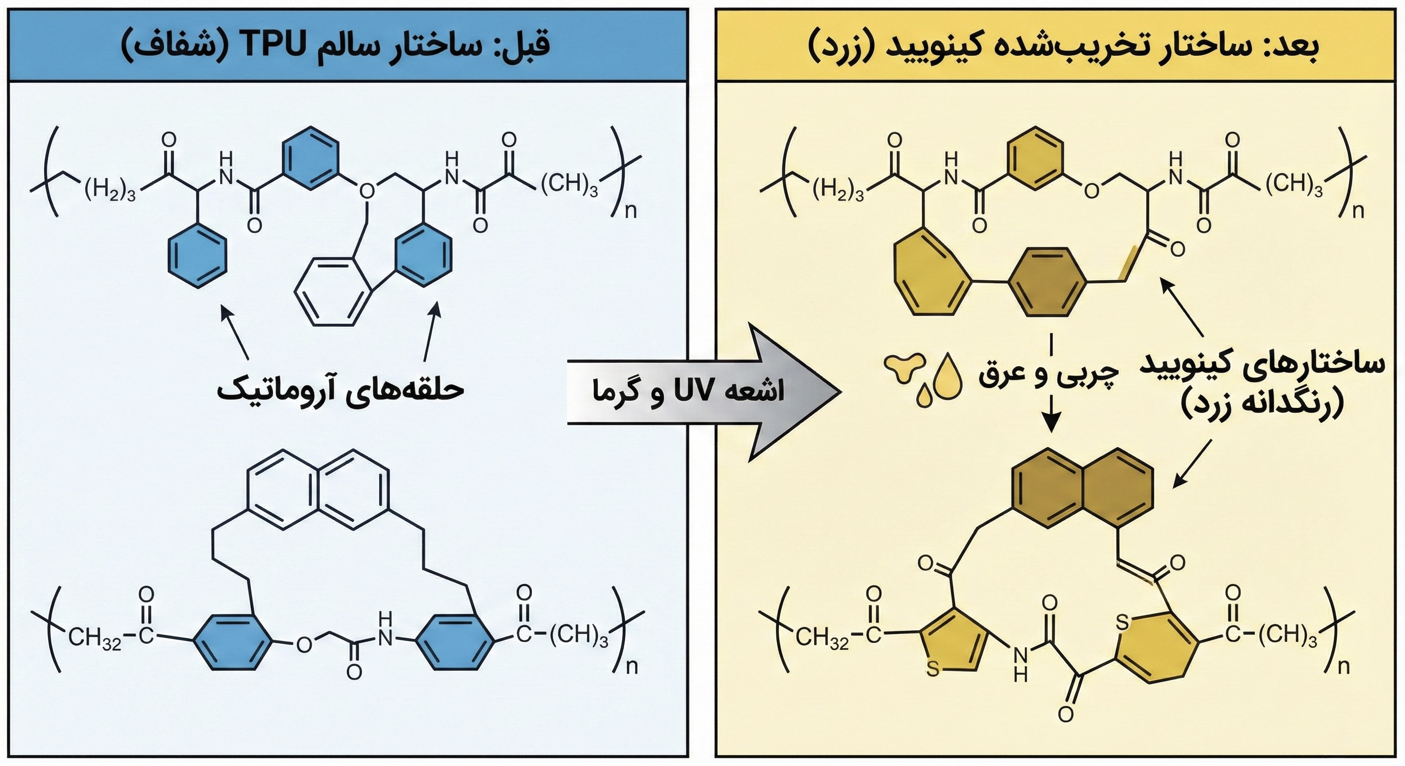 اصلیترین مقصر، نور خورشید و به طور خاص اشعه فرابنفش (UV) است. در ساختار مولکولی بسیاری از TPUها، حلقههای بنزنی یا حلقههای آروماتیک (Aromatic Rings) وجود دارد که نقش مهمی در استحکام پلیمر ایفا میکنند. مشکل زمانی آغاز میشود که فوتونهای پرانرژی UV به این زنجیرههای پلیمری برخورد میکنند.